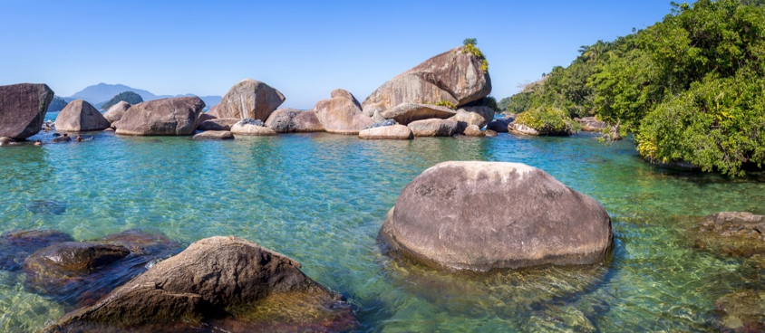 Conhecida pelo intenso tom da água, a Lagoa Azul é ponto certo de parada do mais popular passeio de escuna em Paraty. O local, cercado por rochas e mata verde, é uma grande piscina natural, repleta de vida marinha.