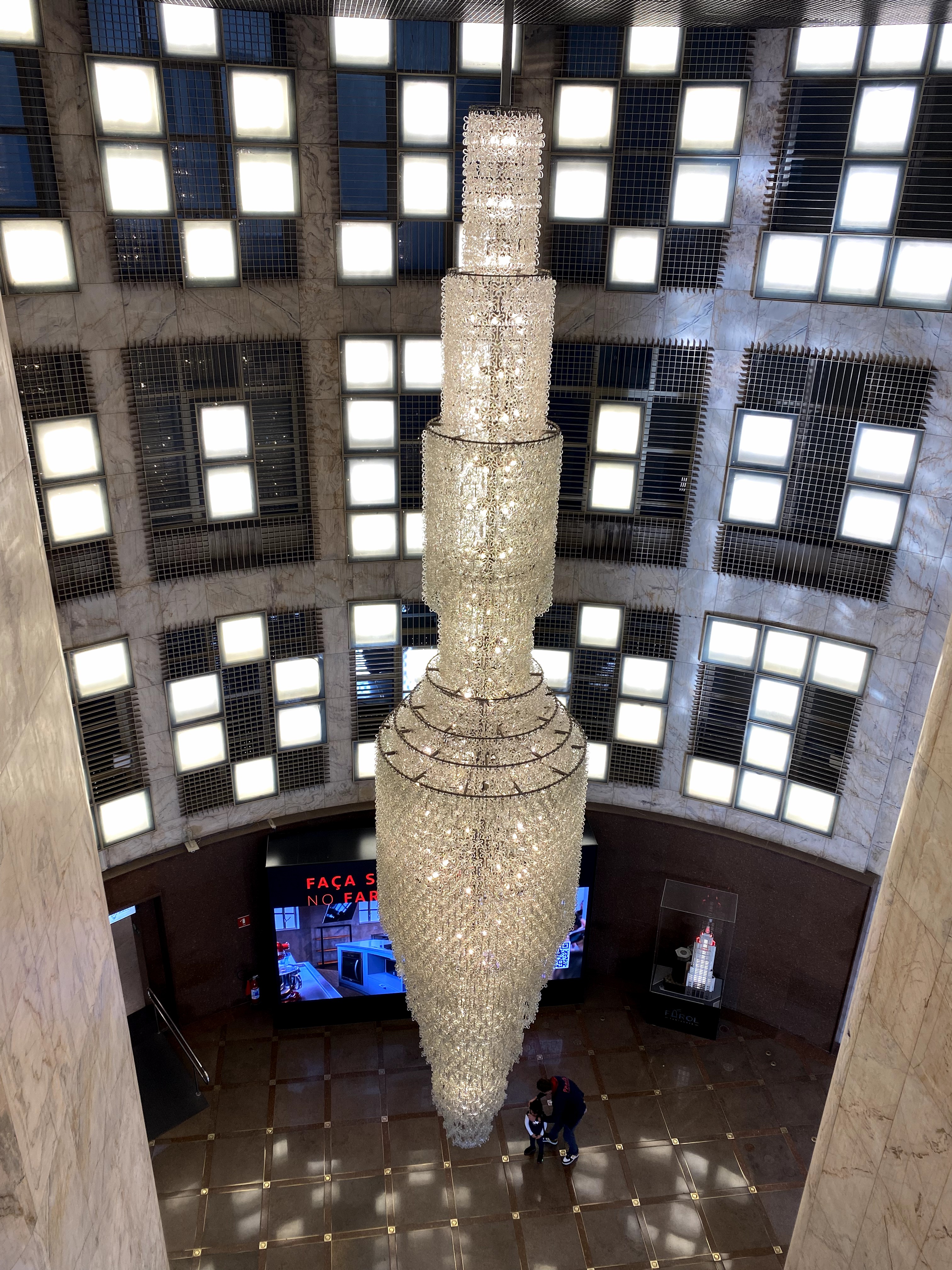 Já no hall de entrada, há um lustre de 13 metros de altura e 1,5 tonelada. No segundo andar, é exibido um vídeo de três minutos que conta a história do edifício Altino Arantes.